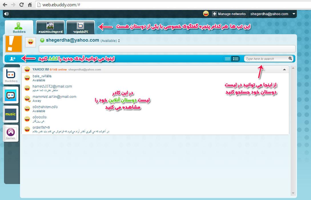 حال وارد محیط چت یاهو شده اید. راهنمای بخش ها را در شکل زیر به صورت گویا ملاحظه کنید: